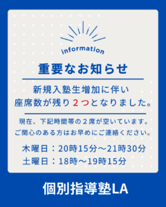 個別指導塾LAでは、新規入塾生の増加に伴い、現在ご案内可能な座席が 残り2席 となりました。