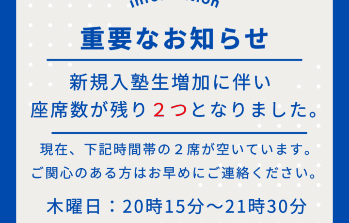 個別指導塾LAでは、新規入塾生の増加に伴い、現在ご案内可能な座席が 残り2席 となりました。
